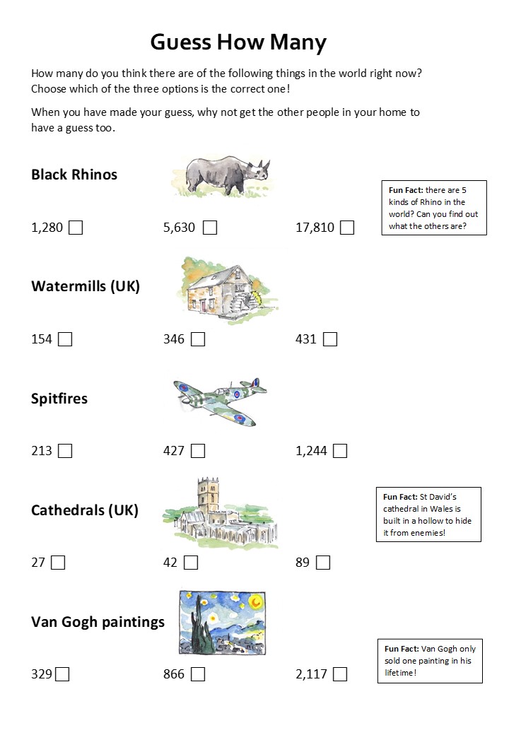 I wonder if you are good at guessing how many things there are? Below is a sheet of questions with 3 possible answers for each one. Tick the answer you think is correct.