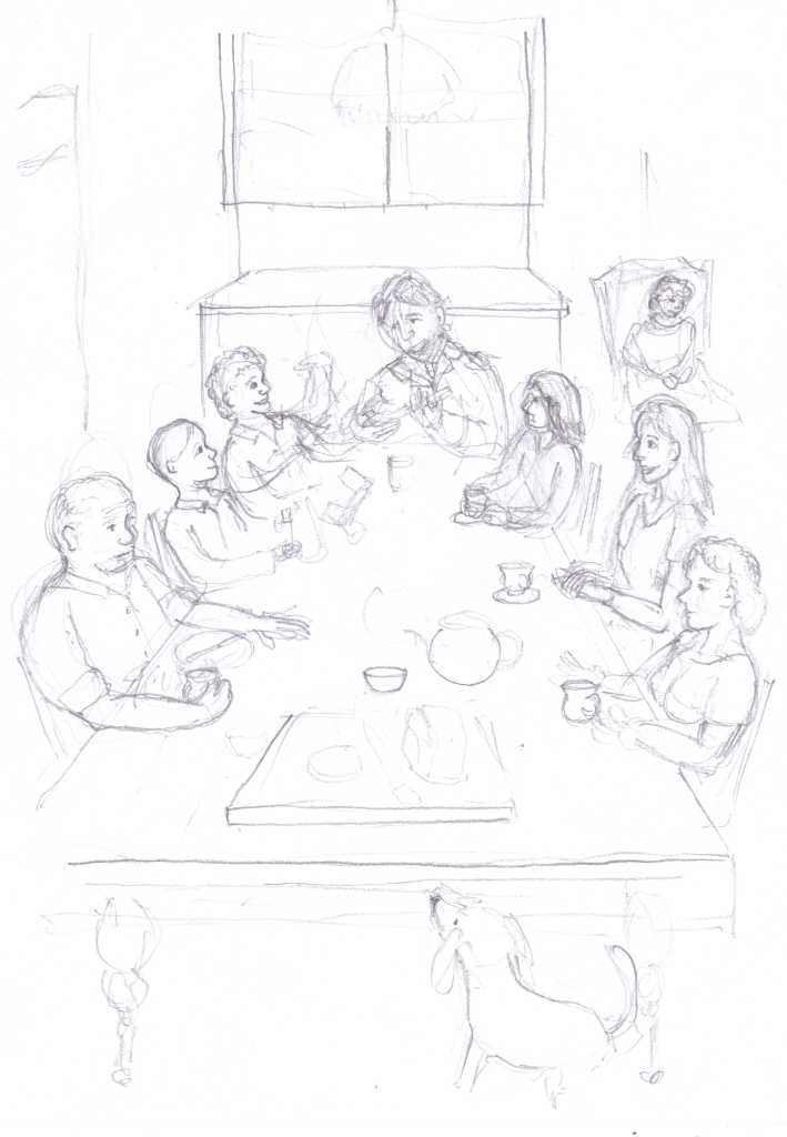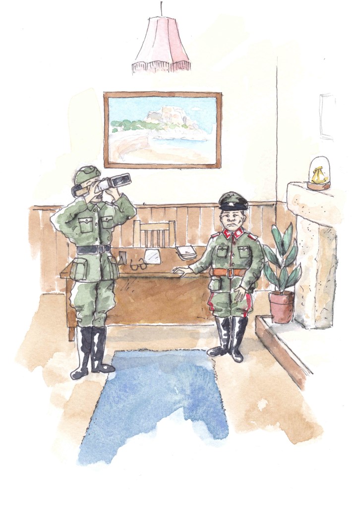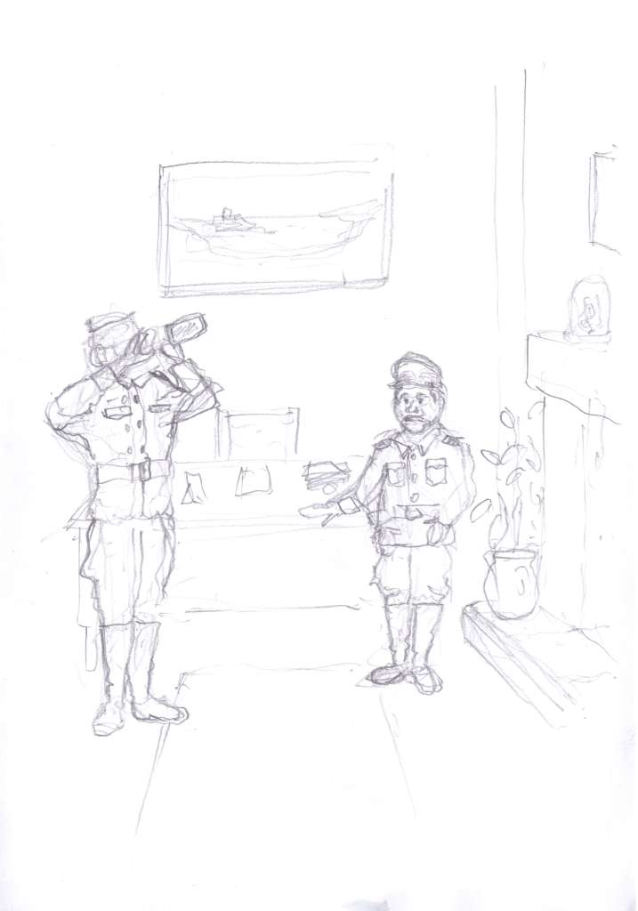 Sometimes you have to do some research to get clothing, furniture and accessories correct for the period the story is set in. For this illustration I had to look up what soldiers in the German army would wear and the difference in uniform between a soldier and a general. Can you see the general has red in his uniform? Even their belt colour is different!