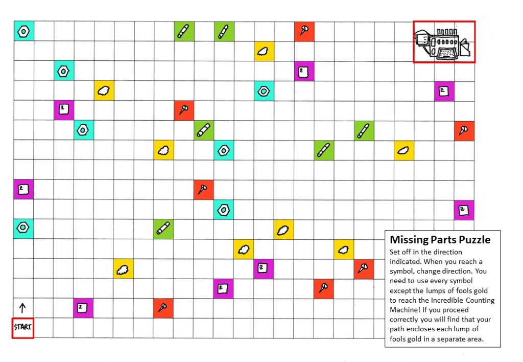 Here’s a colourful puzzle for you! Can you guide Caleb so he picks up all the missing parts and gets them to the Incredible Counting Machine? You need to follow one continuous path, changing direction at each object. But don’t try and pick up the lumps of fool’s gold!