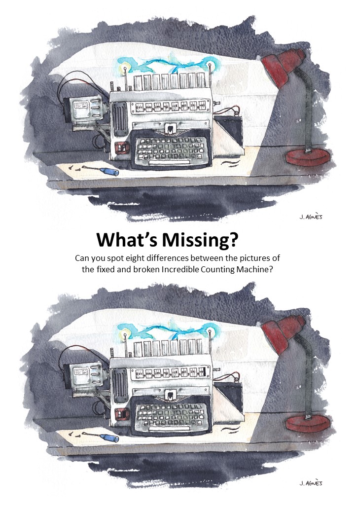 When Grandpa inspects the damaged Incredible Counting Machine he finds there are a few things missing. Can you use your sharp eyes to spot the differences between the pictures of the normal and damaged invention?