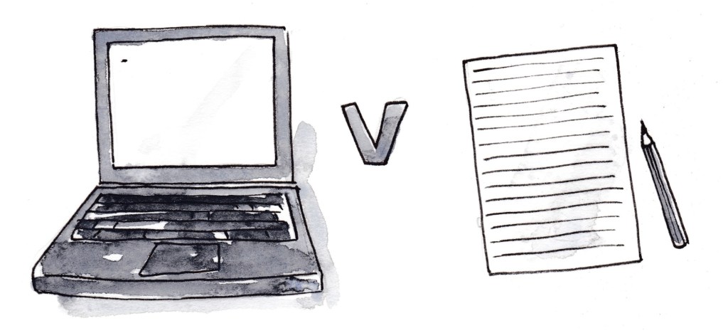 Its really up to you. If you know how to use a computer then it has the advantage that you can keep making changes without having to cross things out and write things out again. If you aren’t very experienced with using a computer then it is fine to write it out by hand. Some people find it easier to think and write by hand anyway. You can always type it up later or ask a grown-up to help you.