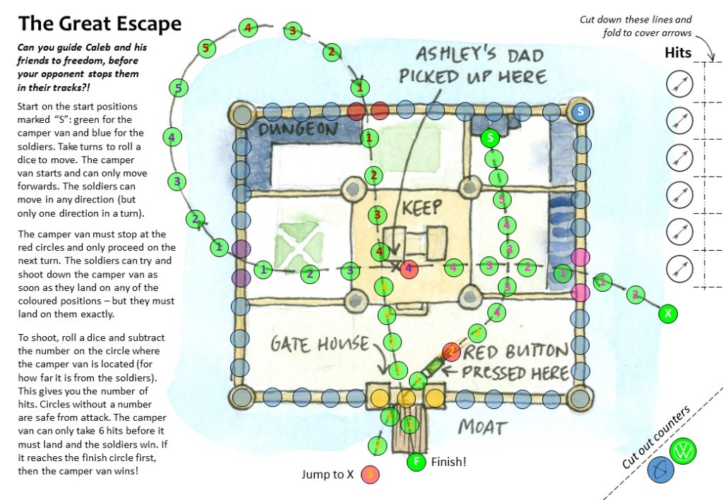 I have taken one of the illustrations in the book and turned it into a game you can play with a friend. One of you is the camper van trying to get away from the castle, and the other takes the role of the soldiers who are trying to shoot it down with their bows and arrows!