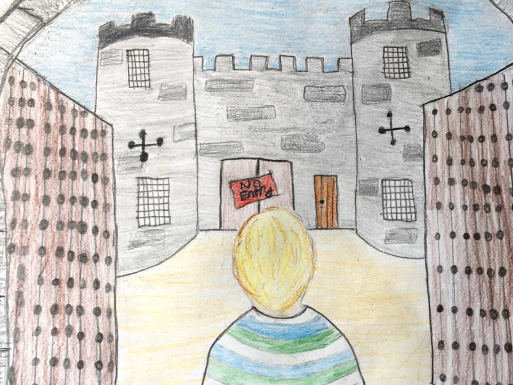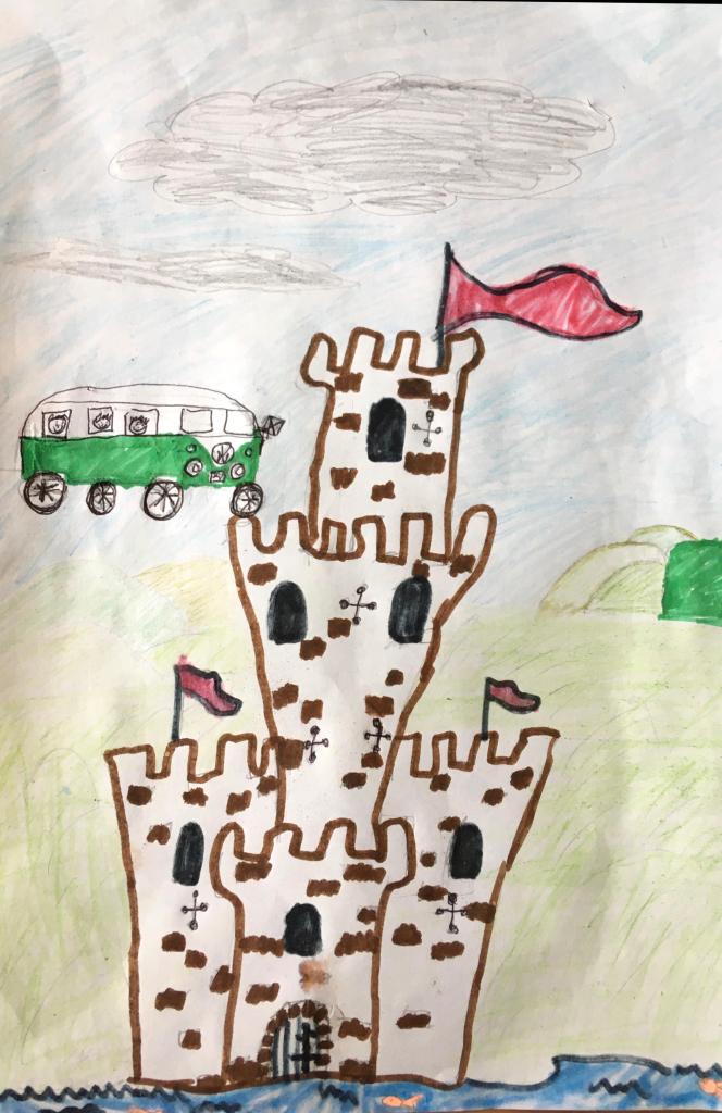 Beth was ambitious with her picture and managed to get the whole castle in! Isn’t it great how the camper van is swooping in past the tower, just about to rescue Ashley’s dad perhaps? I love the strong outlines and the bold colours. The little details add a lot of fun and interest too. Can you see the fish, the loopholes, and… is that Caleb’s smiling face I see?! Well done Beth.