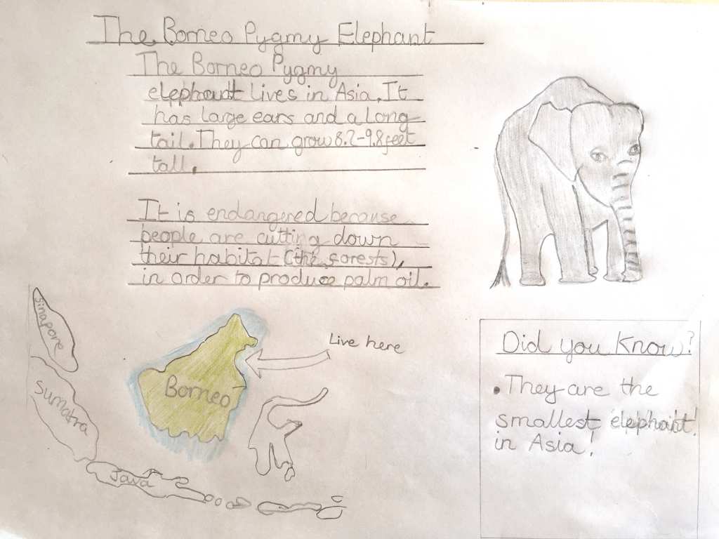 Rhoda H took up the challenge to make a fact sheet about an endangered animal (see post Endangered Species). Hasn’t she done a great job?! What a good idea to include a map and a fun fact. And the illustration is brilliant!